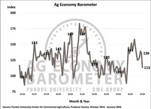 Farmer sentiment weakened sharply in January, as the Purdue University/CME Group Ag Economy Barometer fell 23 points to 113. Producers reported worsening financial conditions compared to a year ago, with half indicating…