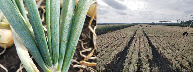 Figure 1. High numbers of thrips feeding all along onion leaves can quickly turn onion plants from green to white, as pictured on the left. This ultimately reduces bulb size, as shown on the right. Photos courtesy Christy Hoepting, Cornell University