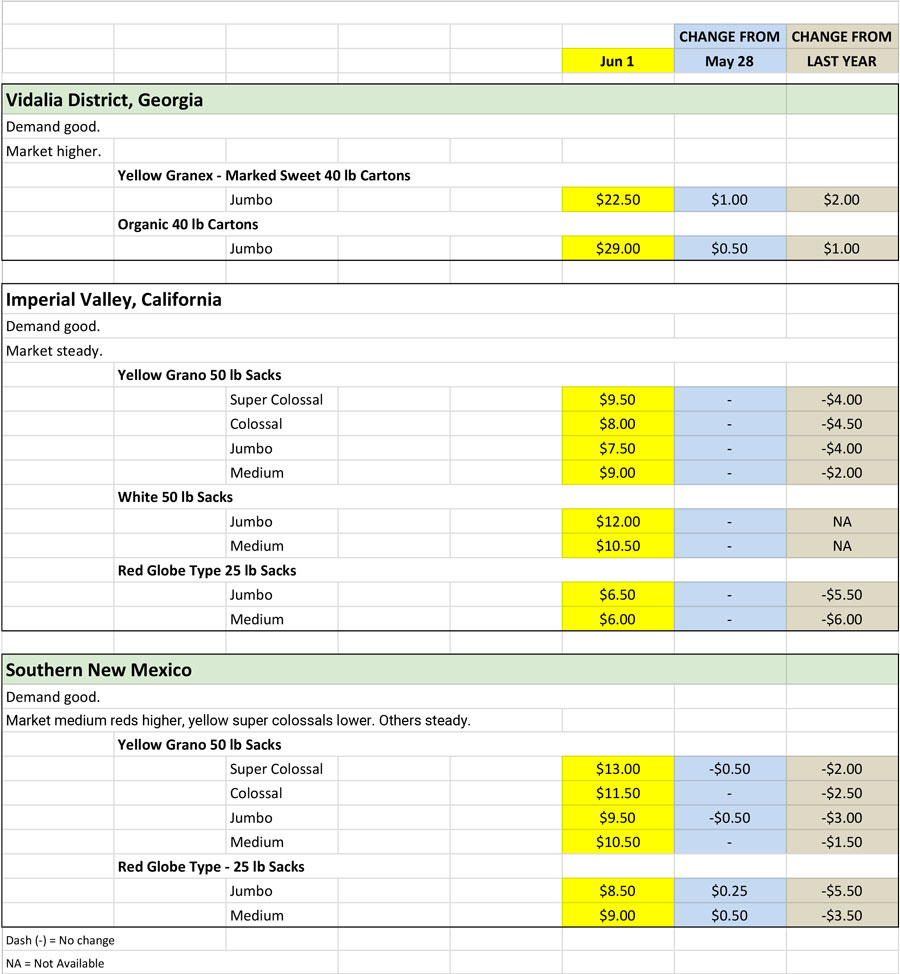 Onion Shipping Point price chart for June 1, 2020