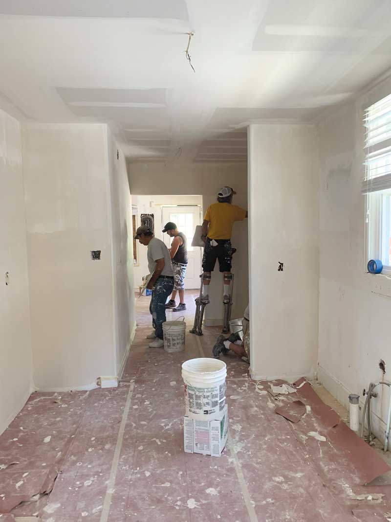 The building was formerly a restaurant, so an extensive remodel was undertaken to create offices. Here, a crew installs drywall.