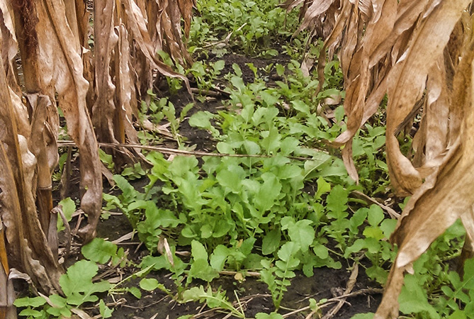 A Daikon radish cover crop emerges after being seeded into standing corn. Radishes help break up soil compaction and use up extra nutrients to reduce runoff. Credit: Ivan Dozier