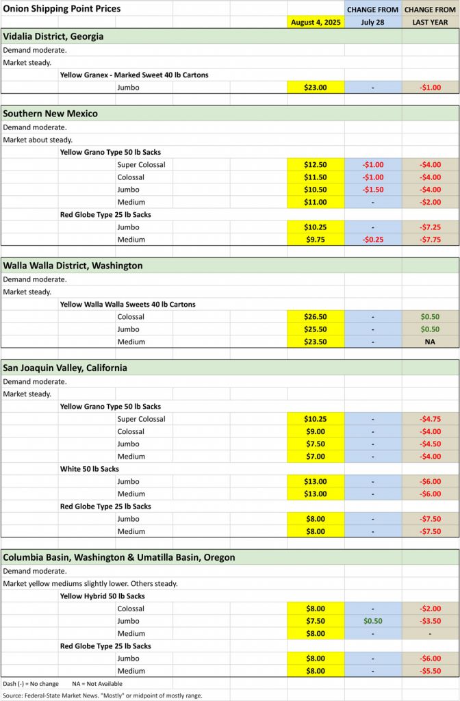 The only yellows available now from the PNW are jumbos and mediums and they are down an average of $2.75 from 2024 at this time. Jumbo and medium reds are now shipping, but they are down $5.75 on average from last year.