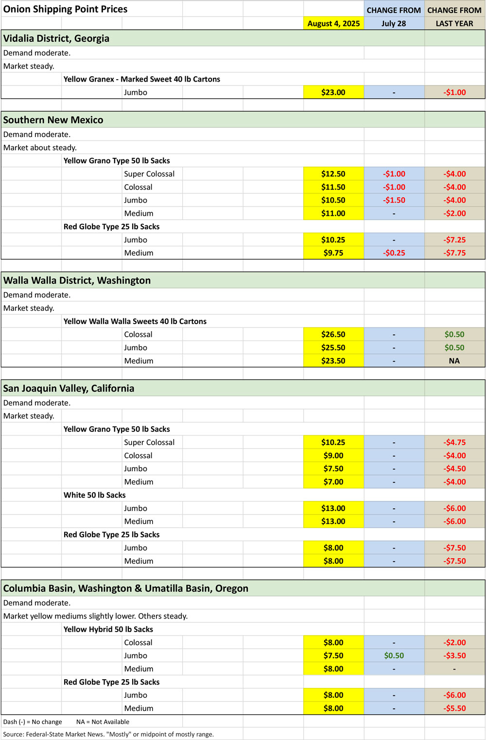 The only yellows available now from the PNW are jumbos and mediums and they are down an average of $2.75 from 2024 at this time. Jumbo and medium reds are now shipping, but they are down $5.75 on average from last year.