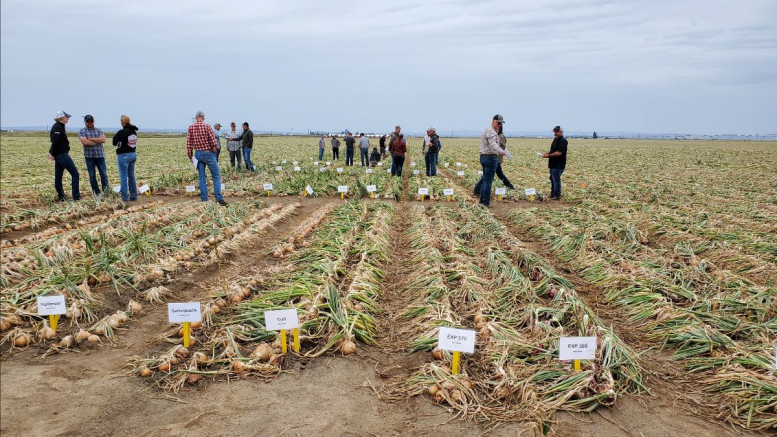 The 2025 Washington State University (WSU) Columbia Basin Onion Cultivar Trial evaluated 44 cultivars and lines using three replicate plots. The onions were planted on March 27 in a drip-irrigated field managed by Weyns Farms east of Othello. Tops down (maturity) and powdery mildew (foliar symptoms) were rated in each plot on August 28 and 29. The onions were harvested on September 23 and evaluated for yield and size distribution. In February, WSU will evaluate the bulbs for quality and bulb rots.