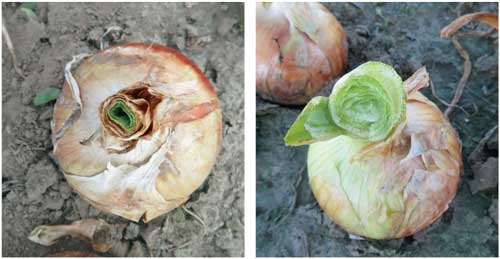 - Avoid late applications of nitrogen fertilizer (after initiation of bulbing). This promotes vegetative growth and delays maturity, resulting in thick-necked onions that take longer to dry and that dry later in the season when field conditions are less favorable for drying.