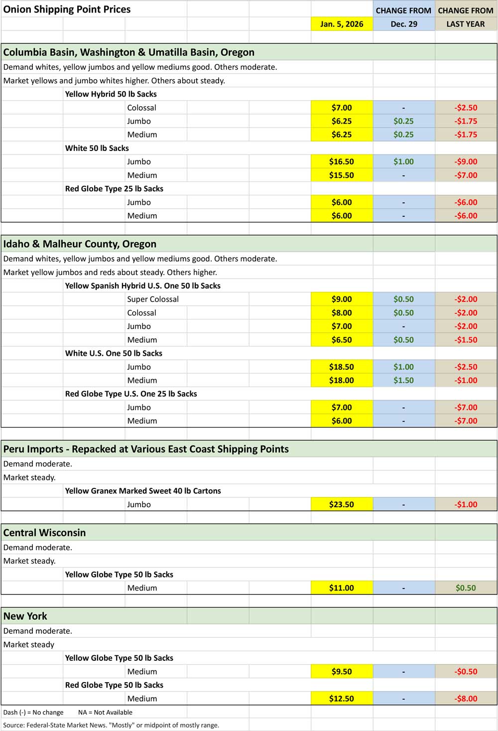 Onion Shipping Point Prices for January 5, 2026
