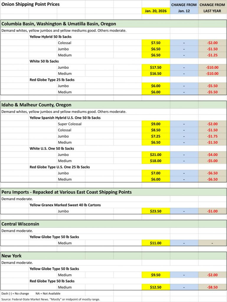 Onion Shipping Point Prices for January 20, 2026